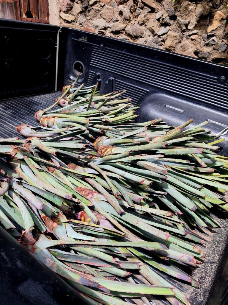 De las cabezas cocidas del maguey se hace el Mezcal, tomando de la planta el nombre de la bebida.聽